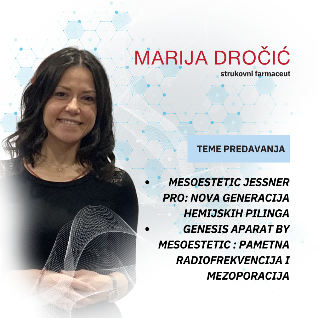 Marija Dročić je strukovni farmaceut sa bogatim iskustvom u farmaceutskoj industriji. Njene edukacije su poznate po interaktivnom pristupu, praktičnim savetima i najnovijim informacijama iz oblasti estetske medicine i kozmetologije. Kao edukator za Mesoestetic brend u kompaniji Medest doo, Marija kontinuirano deli svoje stručno znanje o najnovijim tehnologijama i proizvodima koji omogućavaju stručnjacima iz oblasti estetike da postignu vhunske rezultate za svoje klijente.